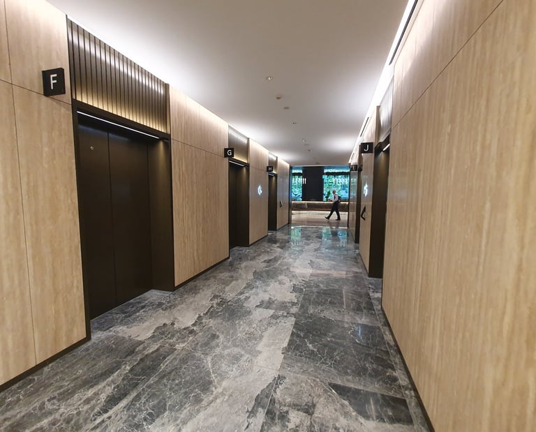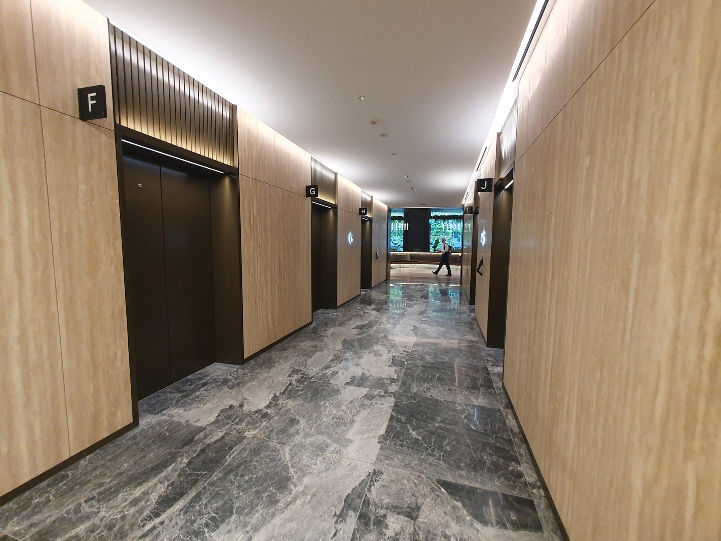 Lift lobby and arrival experience: The lifts have been replaced with some feature an immersive experience with synchronised screen displays, enhancing the arrival journey. Updated timber-finished lobbies add warmth and sophistication.